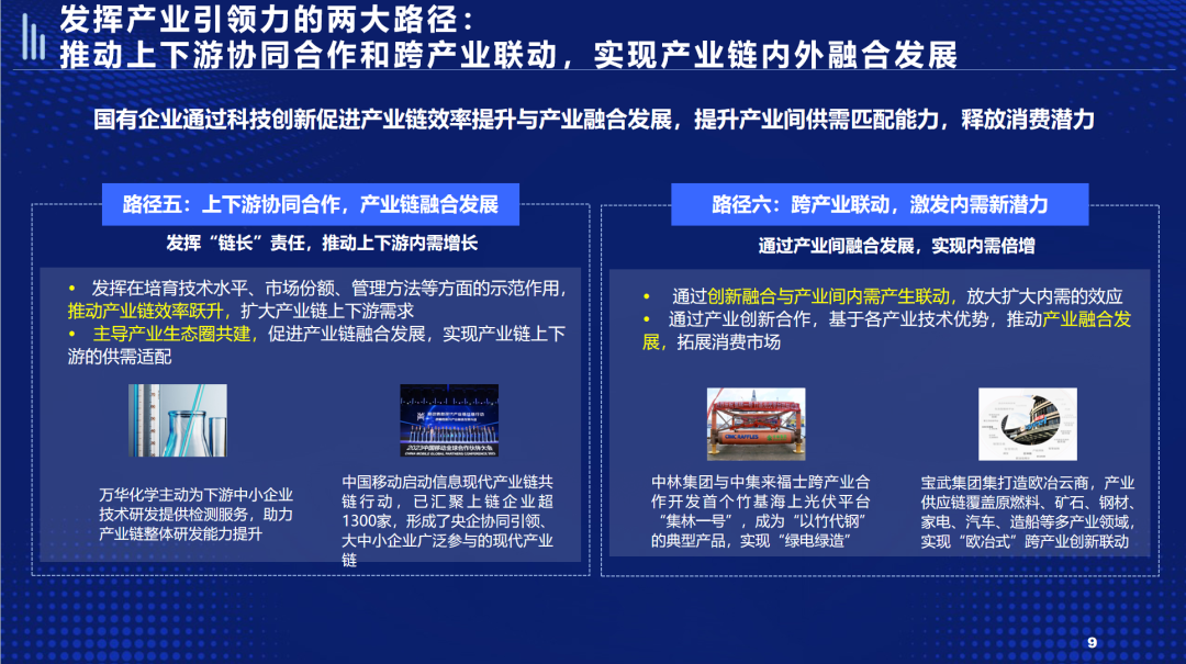 在落实扩大内需的具体方法上,报告总结出国有企业落实扩大内需的六大具体路径。围绕发挥“内需主动力”,提出国有企业聚焦主责主业,通过“拓展消费空间、催生消费业态、增加投资体量、优化投资结构”四大路径,以消费品质升级带动传统市场扩容,以规模优势促进品质消费的渗透,以投资结构的优化带动投资效能的提升,同时保持投资规模的合理增长。围绕发挥“产业引领力”,提出发挥国企的辐射带动作用,通过“产业链融合发展、跨产业联动”两大路径,带动上下游各类关联企业协同发展,实现从投资到消费的传导;通过跨产业供需有效对接和供给创新,拉动内需持续增长。