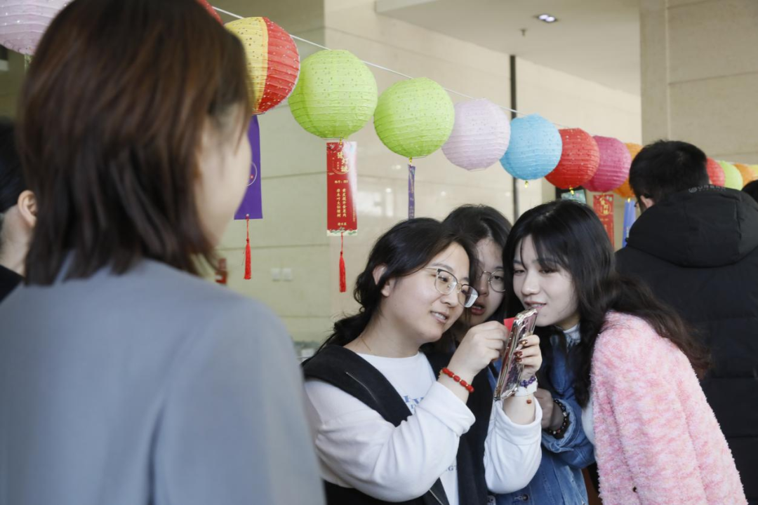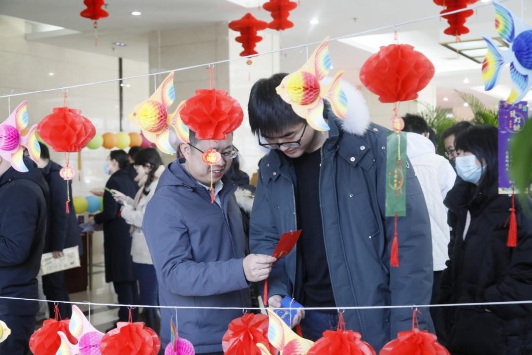 工作人员在集团一楼大厅北侧精心布置了各色灯笼、条幅,悬挂了600多条元宵灯谜,内容丰富多样,既具娱乐性,又具知识性。活动现场,热闹、温馨、其乐融融,大家三五成群,热烈地讨论着灯谜内容,每个人脸上都洋溢着开心的笑容。“红嘴绿鹦哥,吃了营养多”“点点蝌蚪水边游”……一条条妙趣横生、内容丰富的谜题,让大家在赏灯猜谜的同时,享受着传统文化带来的乐趣。