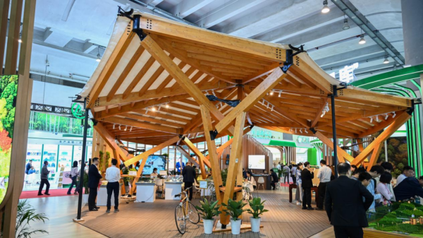 展会上,中林集团聚焦“科学扩绿 为国储材”“创新引领‘双碳’先行”“美丽中国 乡村振兴”“生态产品价值实现”“绿水青山就是金山银山”五大主题,集中展现了中林集团“落实森林‘四库’建设美丽中国”的丰硕成果,展厅面积近500平米,吸引了众多参观者和行业人士的关注。从杭州亚运会亚运村服务中心空降至展厅中心的木结构建筑“云桂”更是成为现场的“明星”展品,吸引了众多参观者驻足观看并拍照留念。