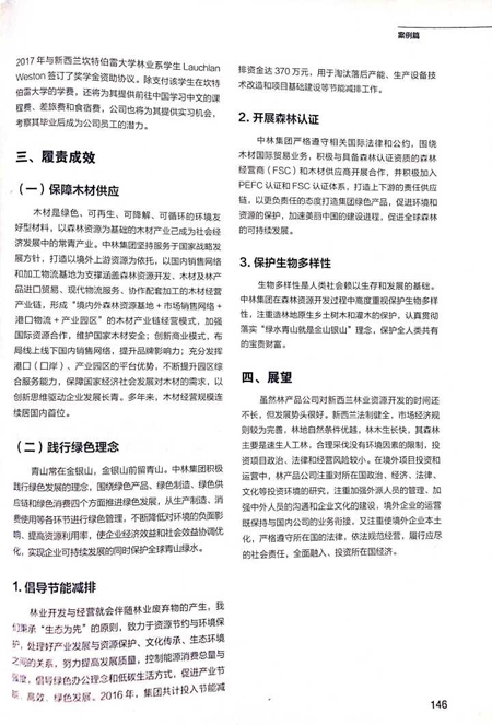 集团公司编写的《合理利用资源 引领行业发展》被收录本年度蓝皮书。编委会充分肯定了集团所属林产品公司积极响应习近平总书记提出的“一带一路”倡议,秉承“共商、共享、共建”原则,遵循市场规律和国际通行规则,依法合规开展国际化经营,不仅促进了当地林业行业健康发展,改善当地民生福祉,更有效提高了中国林业企业木材进口贸易谈判中的话语权,为促进全球森林经营可持续发展做出了重要贡献。