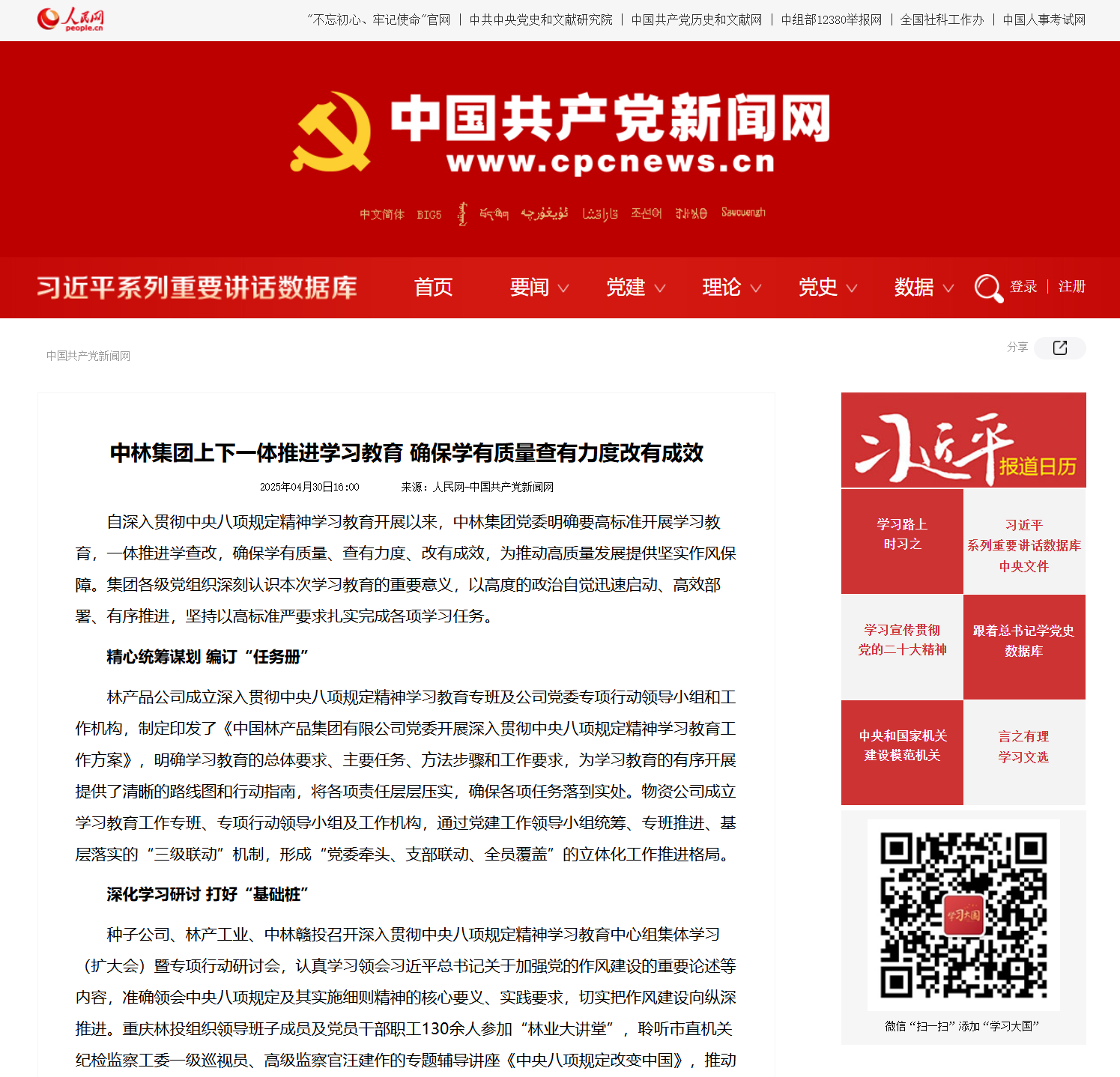 中国共产党新闻网刊发报道——《中林集团上下一体推进学习教育 确保学有质量查有力度改有成效》