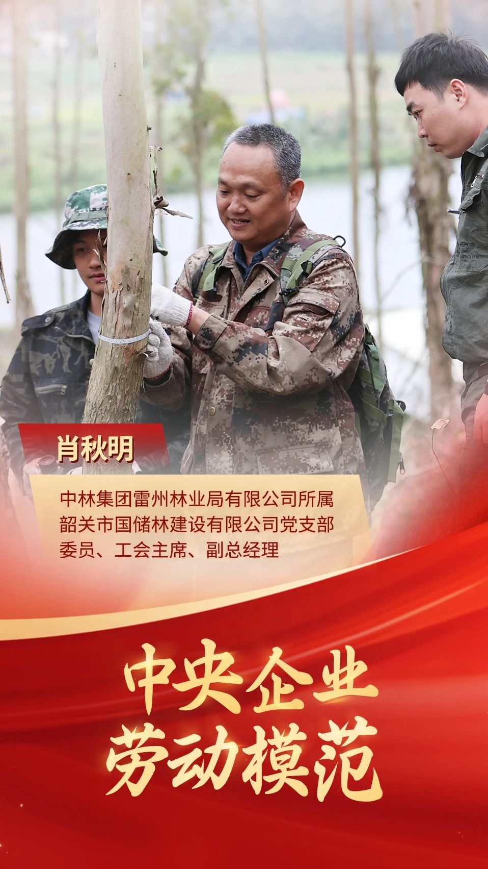 在中华人民共和国成立75周年之际,9月26日,国务院国资委、人力资源社会保障部共同召开中央企业先进集体和劳动模范表彰大会。此次表彰大会中,中林雷林公司韶关市国储林建设有限公司肖秋明同志被授予“中央企业劳动模范”称号。