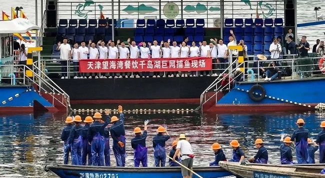 战略合作签约前,天津望海湾餐饮管理公司一行来到千岛湖有机鱼生产基地,开展了有机鱼寻根探源活动,深入了解千岛湖淳鱼生产过程及生长环境,观看“中华一绝——巨网捕鱼”,考察淳鱼鲜冻产品加工厂,参观千岛湖鱼博馆,不仅切身体验到千岛湖淳牌有机鱼的高品质和内涵深远的千岛湖鱼文化,更是对千岛湖生态渔业模式有了更深入的理解。