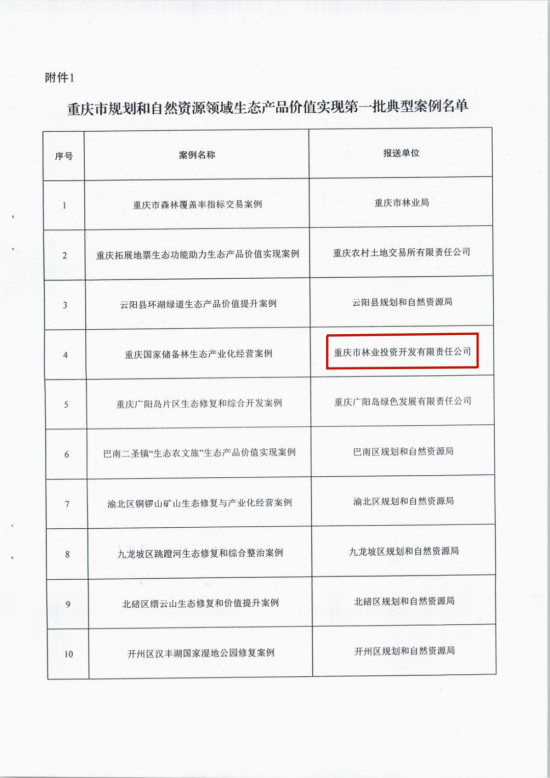 近日,重庆市规划和自然资源局公布了重庆市规划和自然资源领域生态产品价值实现第一批典型案例和优秀组织单位,中林集团所属重庆市林业投资开发有限责任公司荣誉上榜,被认定为第一批典型案例。