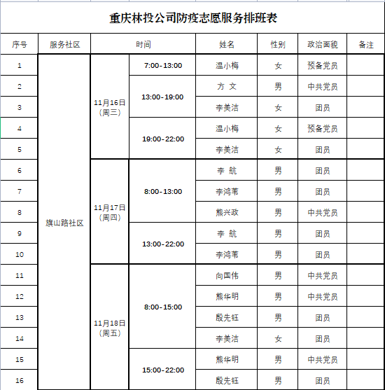 11月16日-18日,重庆林投公司本部党支部抗疫志愿服务小分队在旗山路社区的统一安排下,有序参与社区物资分发、秩序维护、咨询宣讲等服务保障工作。他们说:“初心如磐,使命在肩”,作为一名党员干部、一名央企职工、一名林业人,理应在人民群众最需要的时候主动站出来,越是危难关头,越要发挥共产党员先锋表率作用,以肯干、实干、能干的昂扬斗志展现林业央企责任担当,以实际行动书写党员干部初心使命。