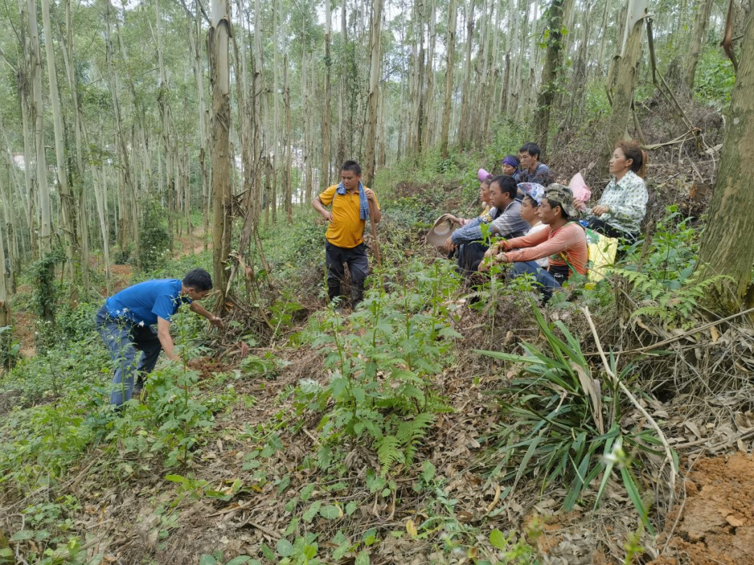 在高要区莲塘镇高斗村林地中,雷林(肇庆)林业投资有限公司生产部新桥工区主管蒙文滔现场给工地新来的工作人员进行岗前指导培训,详细讲解施工规范作业流程。