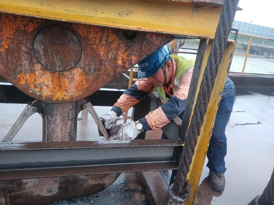 中林如皋港生产部机修工周贤兵在9号引桥口修复吊钩保险装置,保障港口工作安全有序进行。