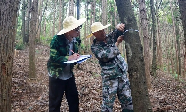 师傅带领徒弟测量、记录林木胸径