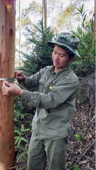 为了说服村民,老莫走村串户,没少下工夫。跟村民拉家常,老莫总是满脸笑容地先递上一支香烟,弯弯绕绕把话题引到桉树上 :“你们说雨天桉树叶落进水坑,水变黑、有毒,不科学。哪种树落叶掉进水坑, 时间久了水的颜色都会有点变化。桉树叶含桉油、有香味,不过绝对没有毒性。”村民半信半疑。“有个外国桉树专家说种桉树是安全的。发展桉树产业,可以有效地解决木材安全问题。”老莫用通俗的话跟村民聊桉树。